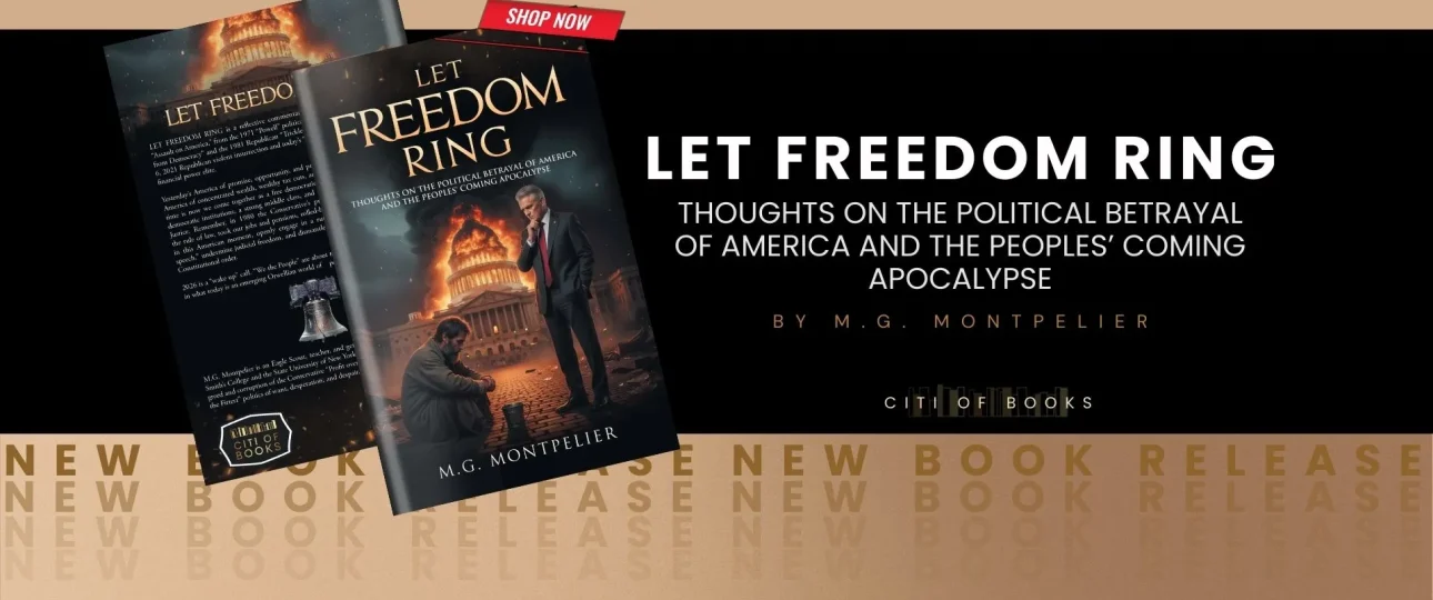 “Let Freedom Ring: Thoughts on the Political Betrayal of America and the Peoples’ Coming Apocalypse” by M.G. Montpelier is a politically oriented book and is positioned in the realm of political commentary, exploring ideas about American governance, perceived betrayal by political leadership, and broader concerns about societal instability and future crises. Proudly published by Citi of Books, this is now available on Amazon, Barnes & Noble, and other major retail platforms.