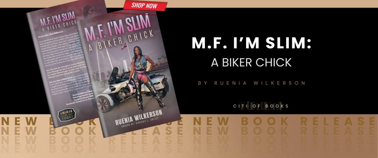 “M.F. I’m Slim: A Biker Chick” by Ruenia Wilkerson is a bold, unfiltered memoir that chronicles a woman’s journey through survival, self-discovery, and empowerment within the raw realities of biker culture. Proudly published by Citi of Books, this is now available on Amazon, Barnes & Noble, and other major retail platforms.