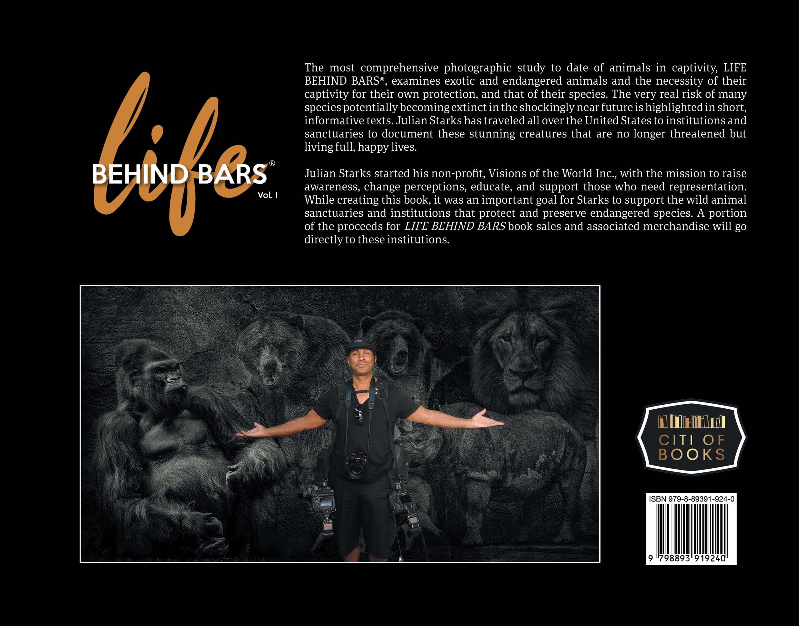 Julian Starks started his non-profit, Visions of the World Inc., with the mission to raise awareness, change perceptions, educate, and support those who need representation. While creating this book, it was an important goal for Starks to support the wild animal sanctuaries and institutions that protect and preserve endangered species. A portion of the proceeds for LIFE BEHIND BARS Vol. 1 book sales and associated merchandise will go directly to these institutions.