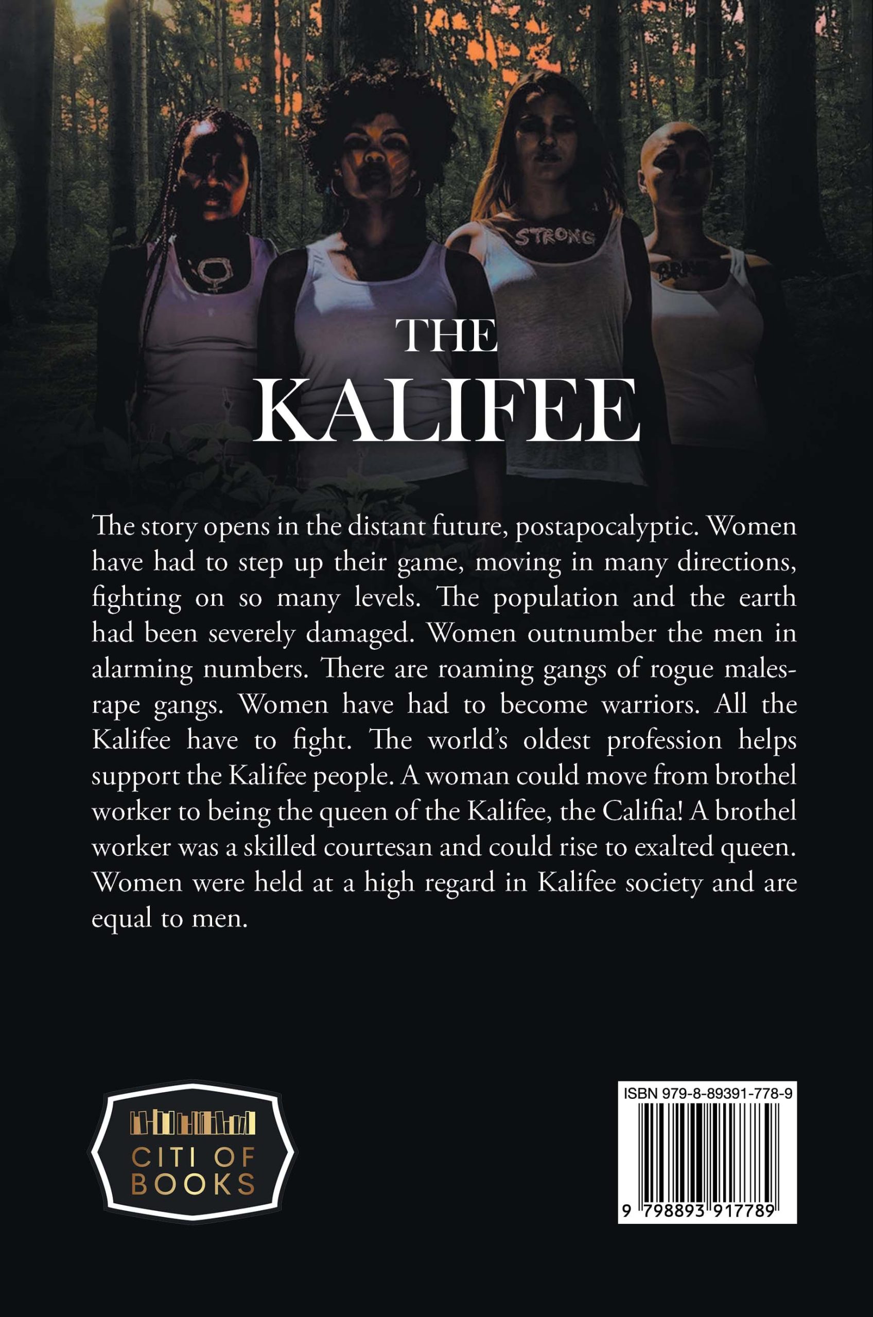 The story opens in the distant future, postapocalyptic. Women have had to step up their game, moving in many directions, fighting on so many levels. The population and the earth had been severely damaged. Women outnumber the men in alarming numbers. There are roaming gangs of rogue males-rape gangs. Women have had to become warriors. All the Kalifee have to fight. The world’s oldest profession helps support the Kalifee people. A woman could move from brothel worker to being the queen of the Kalifee, the Califia! A brothel worker was a skilled courtesan and could rise to exalted queen. Women were held at a high regard in Kalifee society and are equal to men.